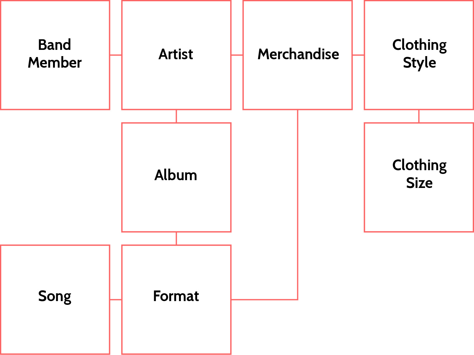 For example, let’s imagine you run a record label, and that users are coming to your website to purchase merchandise for one of the artists on that label. From right here, we can start sketching out the types of things they’ll be looking for. For example, digging down into the information necessary to sell an artist’s music we find that: