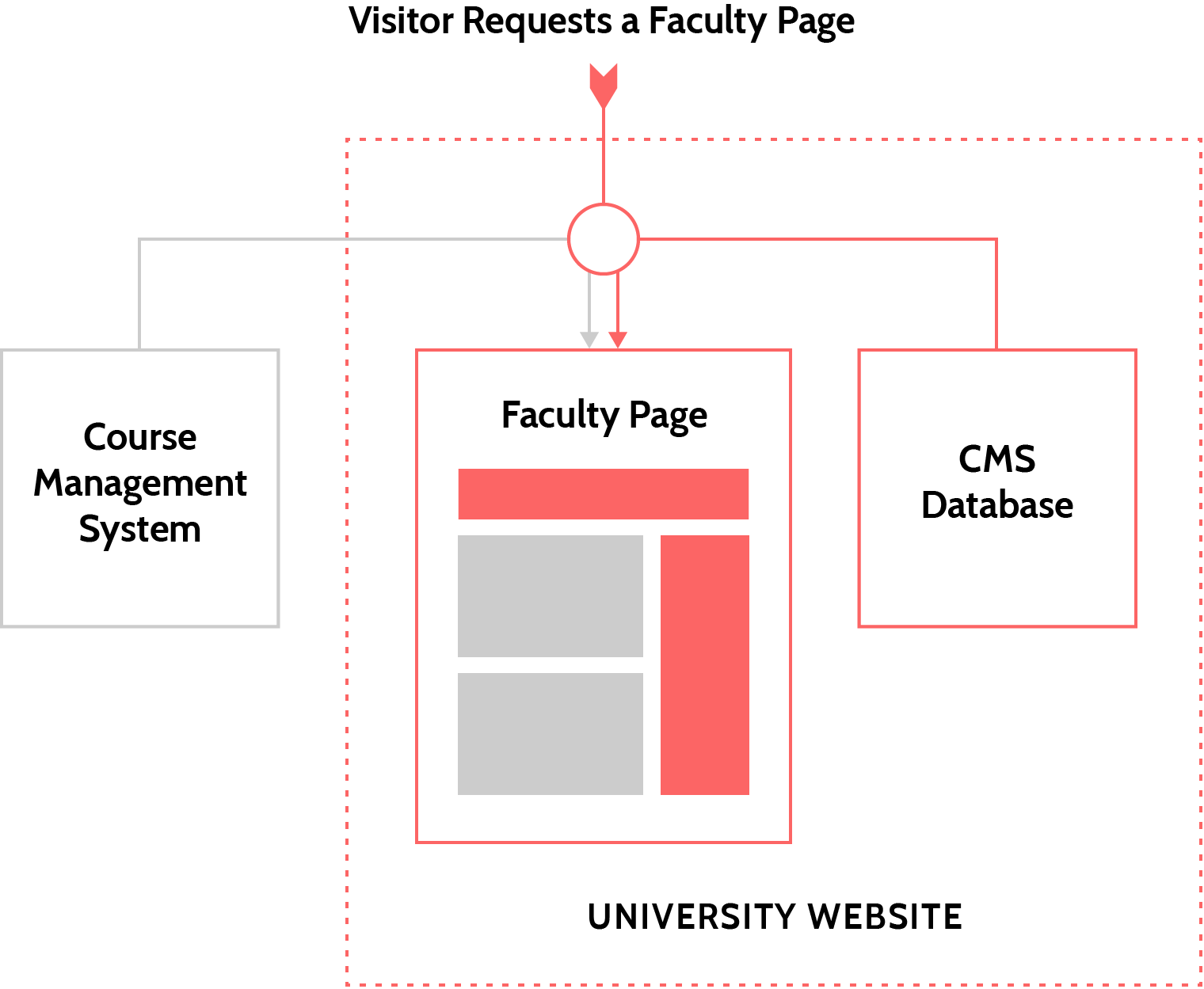 Figure 14.1: The delivery of a faculty page to the requesting visitor is an internal mixing of content from the CMS repository and an external system.